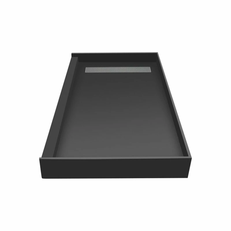 - One-piece, pre-pitched shower pan with integrated curb, splash walls, and 2″ PVC drain