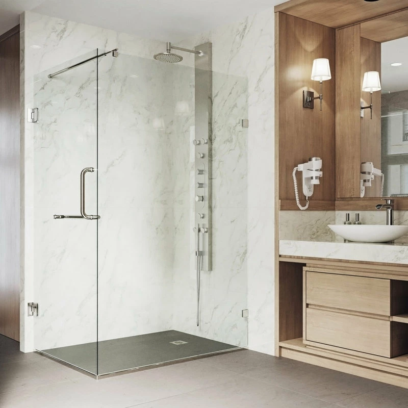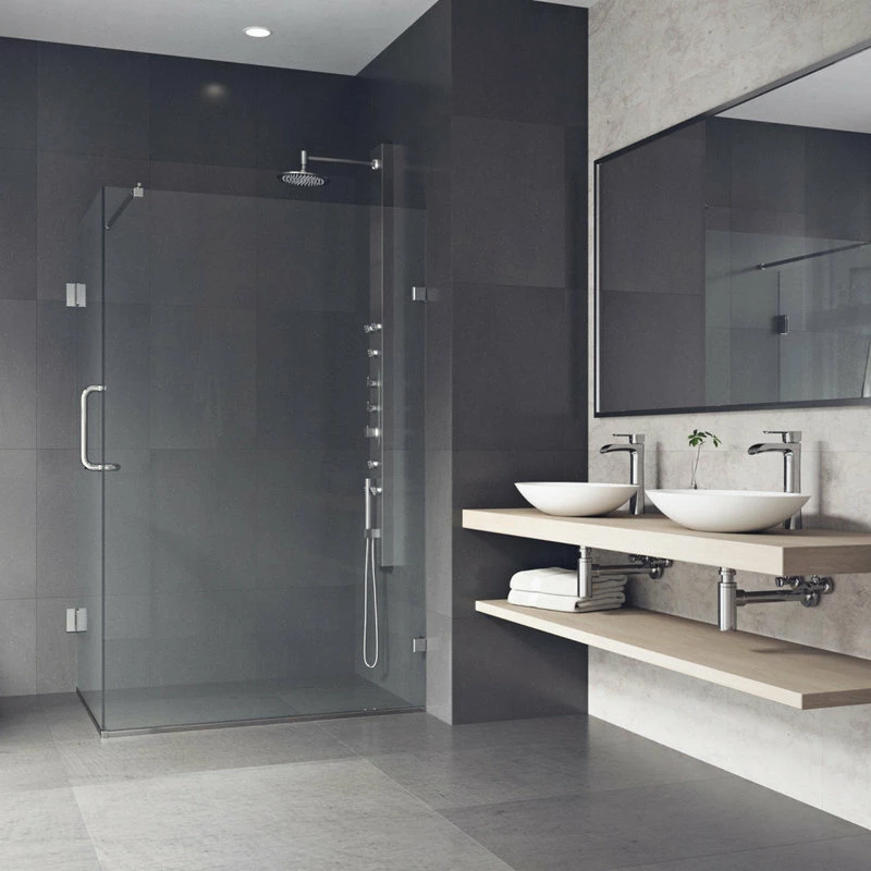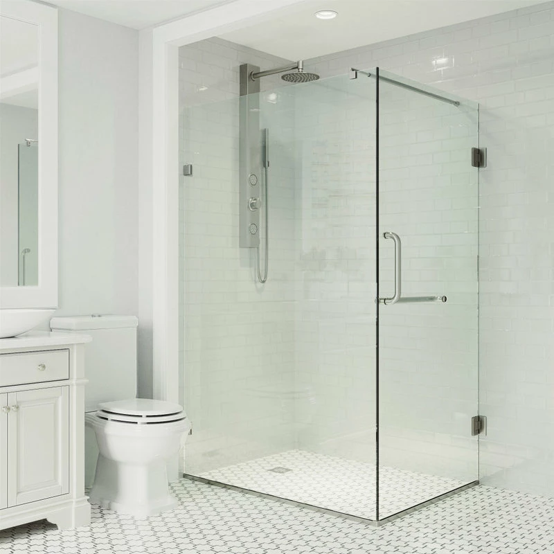 With touches of hardware, the Pacifica by VIGO delivers a sophisticated aesthetic for any bath design. Premium 7-layer finished hardware adds sleek texture to thick tempered glass. Designed for corner installations, this shower enclosure accommodates a variety of spaces and provides a spacious layout. Engineered with proprietary technology, it marries innovation with style to create an exceptional shower enclosure. The curved handle doubles as a towel bar and assists in seamless walk-in shower entry. The Pacifica invites you to step into a peaceful spa-like oasis.