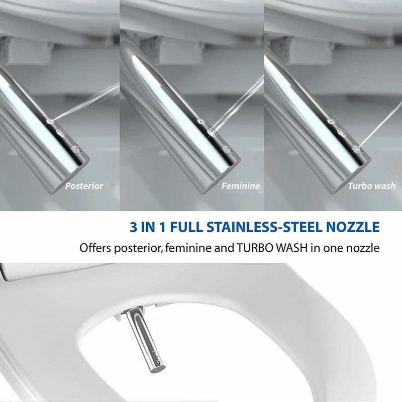 FULL STAINLESS NOZZLE – Performs feminine, posterior, and TURBO WASH functions, rhythmic movement and 5 different nozzle positions. One touch self-cleaning and semi-permanent use of nozzle.