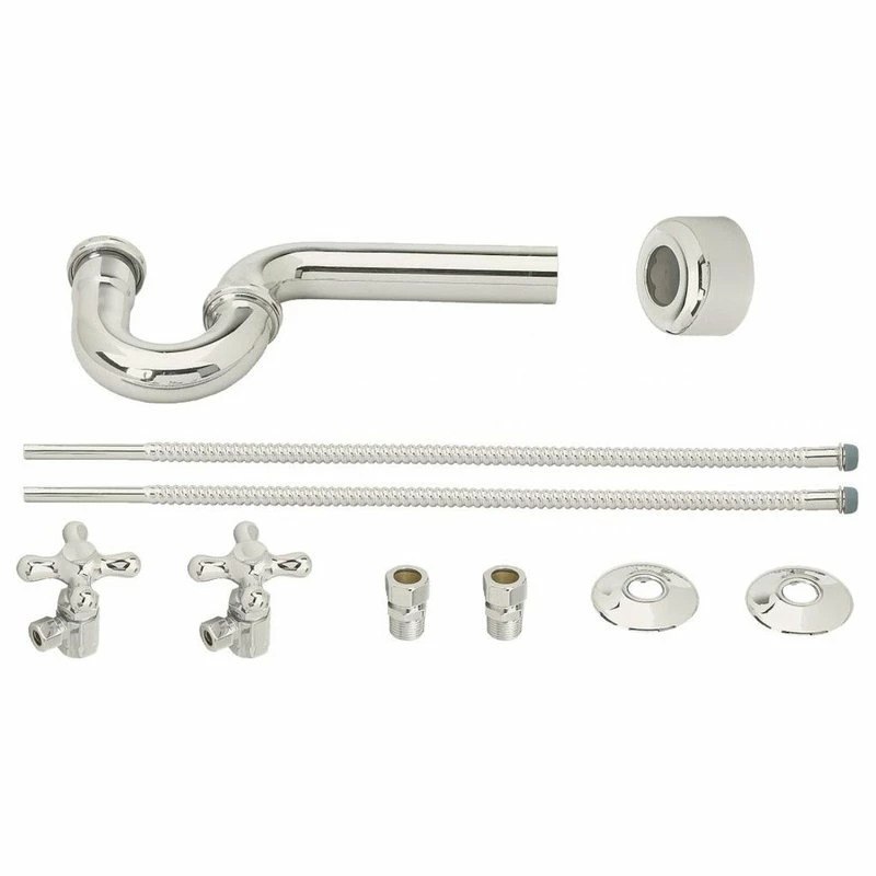 This Westbrass Pedestal Lavatory Kit with universal 3/8 in. angle stops with cross handles, 3/8 in. x 20 in. corrugated annealed brass risers, and 1-1/2 in. x 1-1/2 or 1-1/4 in. P-Trap with high box flange, is perfect for dressing up an exposed or console style Kitchen or Bathroom sink. The angle stops fit both 1/2 in. IPS or 1/2 in. Copper Pipe (5/8 in. Nominal) and come with sure grip flanges to fit both sizes. Changing washers allows the P-Trap to fit both Kitchen and Bath sinks, and is the perfect finished compliment for any 1-1/2 in. IPS sink rough-in.
